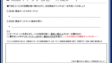 キャッチコピー作成初心者でも効果的なキャッチコピーを作れるます!6つの技術を使った「商品キャッチコピー作成シート」を完成させ販売・宣伝に役立ててください。